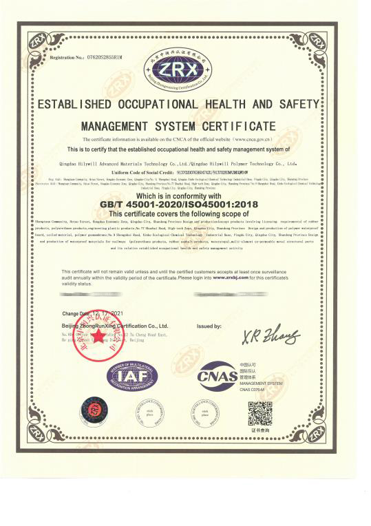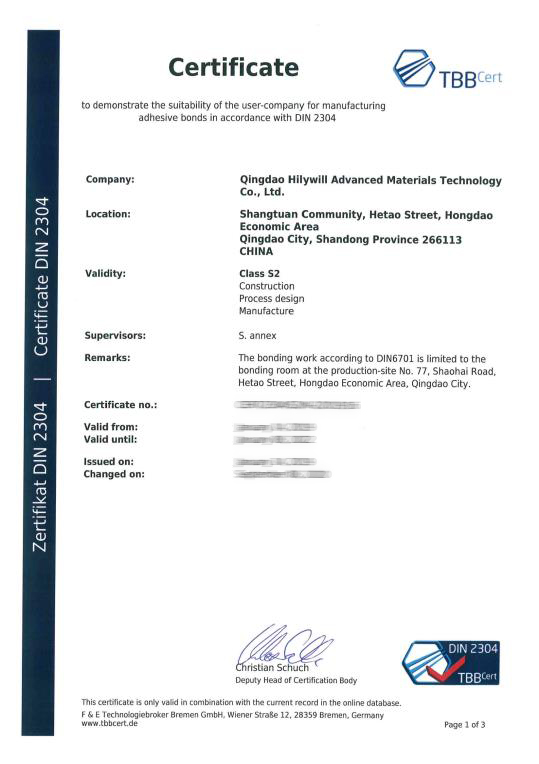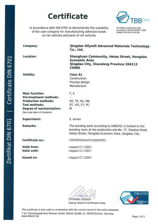 公司通過了質(zhì)量管理體系ISO9001、國際汽車行業(yè)標(biāo)準(zhǔn)IATF16949、國際鐵路行業(yè)標(biāo)準(zhǔn)ISO/TS22163、德國粘接標(biāo)準(zhǔn)DIN6701、中國鐵路CRCC產(chǎn)品認(rèn)證、環(huán)境管理體系ISO14001、職業(yè)健康安全管理體系ISO45001等多項(xiàng)體系認(rèn)證。